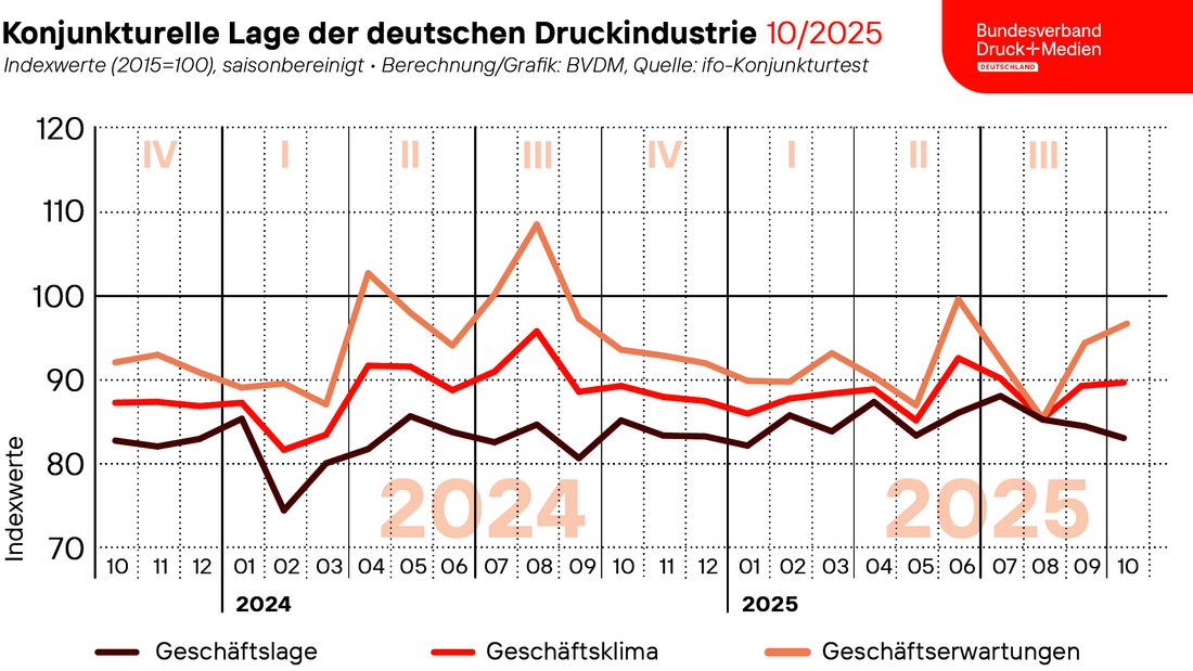 Im Oktober 2025 zeigte sich das saisonbereinigte Geschäftsklima in der deutschen Druck- und Medienindustrie stabil. Der vom Bundesverband Druck und Medien ermittelte saisonbereinigte Geschäftsklimaindex wies gegenüber dem Vormonat einen Zuwachs von 0,4 Prozent auf. Mit 89,9 Punkten lag der Index damit im Oktober rund 0,4 Prozent über dem Niveau des Vorjahresmonats. Während die aktuelle Geschäftslage von den Unternehmen etwas schlechter bewertet wurde als im September, verbesserten sich die Erwartungen für die kommenden sechs Monate. Diese positive Entwicklung der Geschäftserwartungen trug maßgeblich zur Stabilisierung des Geschäftsklimas bei.