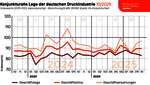 Der saisonbereinigte Geschäftslageindex verschlechterte sich im Oktober leicht. Mit 83,3 Punkten notierte der Index um 1,6 Prozent niedriger als im Vormonat und lag damit 2,4 Prozent unter dem entsprechenden Vorjahresmonat. Diese Entwicklung ist auf eine veränderte Lagebewertung der Unternehmen zurückzuführen. Der Anteil der Betriebe mit positiver Einschätzung ihrer aktuellen Situation verbesserte sich von 5 Prozent auf 9 Prozent. Der Anteil der Unternehmen mit negativer Beurteilung ihrer Geschäftslage erhöhte sich von 30 Prozent auf 39 Prozent; gleichzeitig sank der Anteil neutraler Einschätzungen von 65 auf 53 Prozent. Insgesamt führte dies zu einer Verschlechterung des saisonbereinigten Saldos von -25 auf -28 Prozentpunkte. Die Bewertungen des aktuellen Auftragsbestandes fallen weiterhin überwiegend negativ aus. Lediglich 8 Prozent der befragten Unter-nehmen beurteilen ihren Auftragsbestand positiv, während 37 Prozent eine neutrale Bewertung und 55 Prozent eine negative Einschätzung abgeben. Der resultierende Saldo von -48 Prozentpunkten ist jedoch besser als im Vormonat, als der Saldo noch bei -59 Prozentpunkten lag. Die Kapazitätsauslastung in der Druck- und Medienindustrie liegt mit 74,5 Prozent ca. 2,4 Prozent unter der Auslastung des Vorjahresmonats. Insgesamt ist die durchschnittliche Kapazitätsauslastung für den Zeitraum Januar bis Oktober 2025 im Vergleich zum Vorjahreszeitraum mit -0,3 Prozent nahezu unverändert. Etwas mehr als die Hälfte der Unternehmen (60 Prozent) klagte im Oktober über Produktionsbehinderungen. Mit einem Anteil von 49 Prozent war der Auftragsmangel weiterhin das größte Produktionshemmnis gefolgt vom Fachkräftemangel mit 21 Prozent.