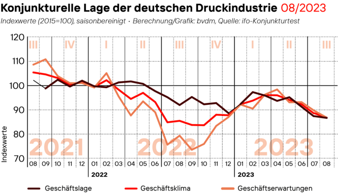 Zum Jahresende 2023 verzeichnete das saison- und kalenderbereinigte Geschäftsklima der deutschen Druck- und Medienbranche einen leichten Rückgang. Während die Geschäftsaussichten für die nächsten 6 Monate merklich zurückgingen, stiegen die Einschätzungen hinsichtlich der aktuellen Geschäftslage leicht an. Der vom Bundesverband Druck- und Medien berechnete Geschäftsklimaindex sank saison- und kalenderbereinigt um 0,7 Prozent im Vergleich zum Vormonat ab. Mit 86,5 Punkten notierte der Index im Dezember rund 1,7 Prozent unter seinem Vorjahresniveau und bildete damit den Jahrestiefstand.